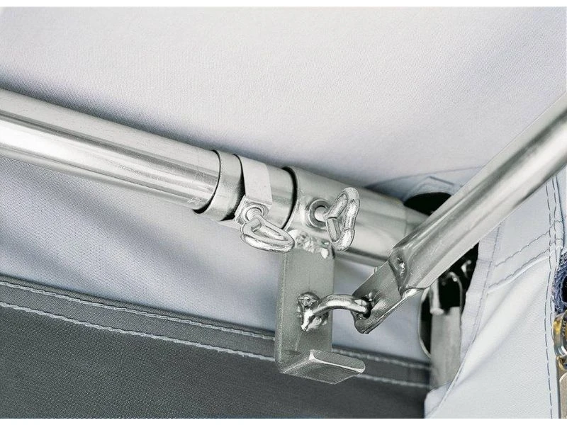 Een optimale pasvorm aan de voortent door middel van het speciale bevestigingssysteem onder de petluifel van de voortent. Het speciale luifelframe is voorzien van 3 bevestigingsbeugels die op het frame van de voortent worden gemonteerd. Deze bevestigingsbeugels kunnen universeel op zowel stalen als alumnium voortenframes worden gemonteerd in de buisdiameters 25 en 28. Voor 32 mm frames leveren wij een aangepaste bevestigingsbeugel.