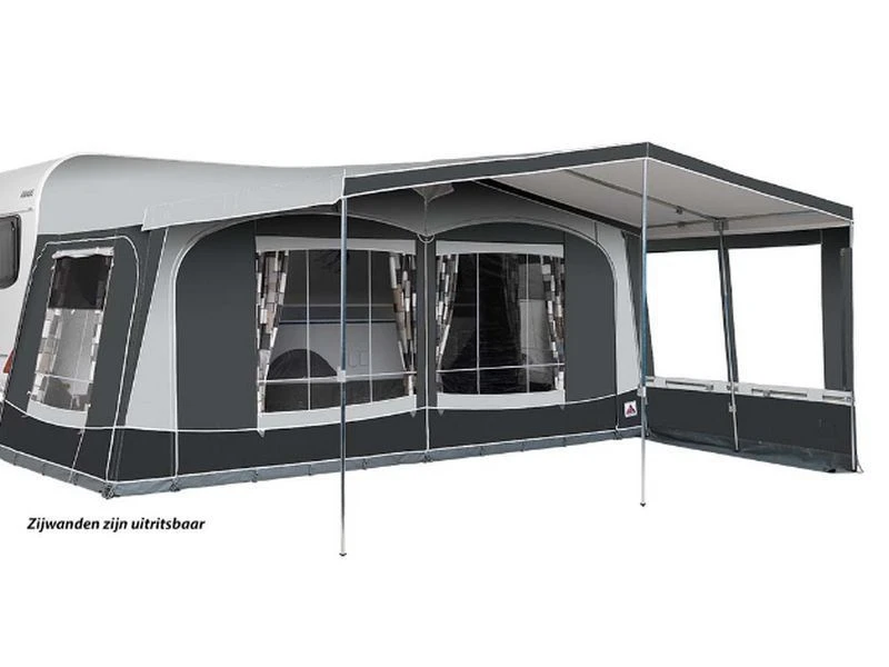Het extra stevige Ten Cate All Season tentdoek en het versterkte 25mm luifelframe zorgen voor extra stabiliteit en maken deze voortentluifel bij uitstek geschikt voor seizoensgebruik. Standaard zijn alle stangen voorzien van EasyGrip buisklemmen voor extra gebruiksgemak. De zijwanden van de Locarno Season zijn volledig uitritsbaar. Een waardevolle uitbreiding van het reeds uitgebreide Doréma-luifelassortiment.